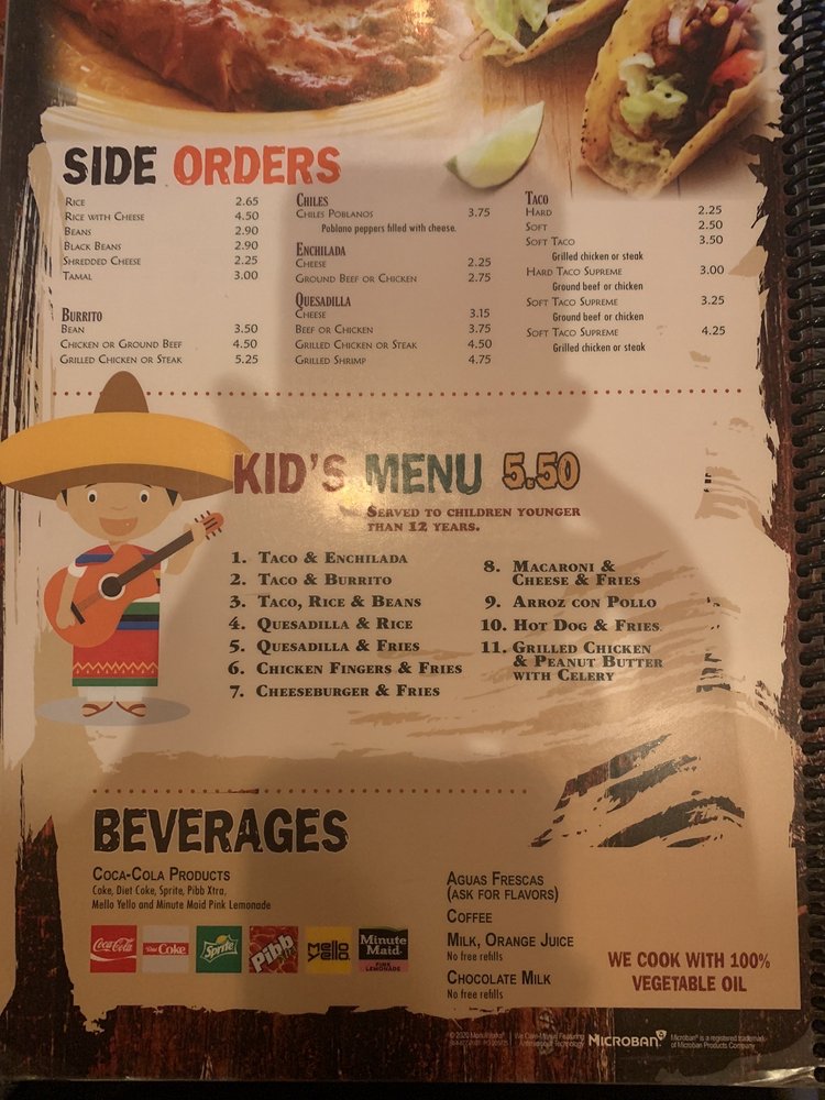 Kid's menu selection featuring a single taco with various fillings options: Pepe, spicy, marinated pork, grilled steak, pork carnitas, chorizo, or grilled chicken. Served with rice & beans.