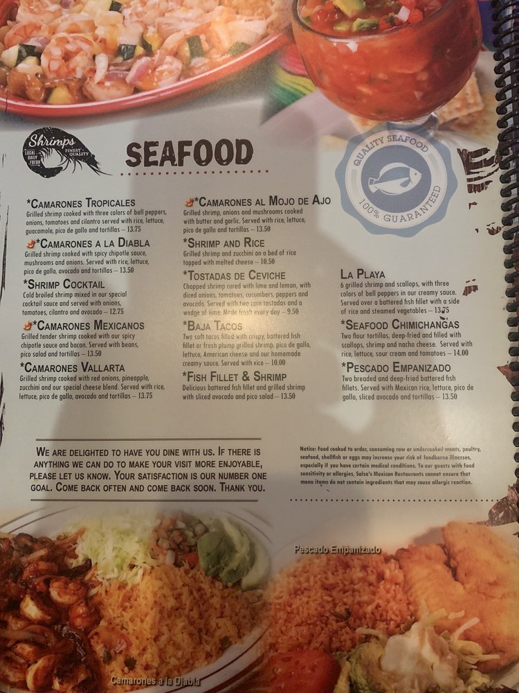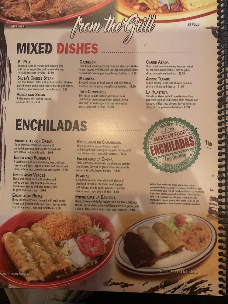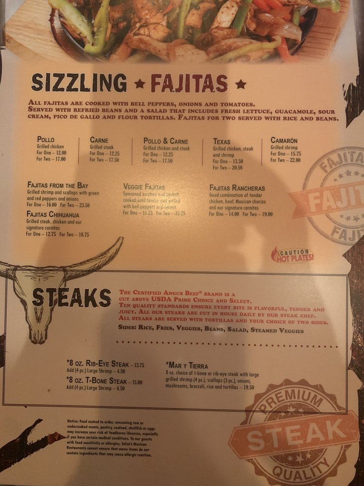 Grilled steak. Certified Angus beef. Notice: Food cooked to order, consuming raw or undercooked meats, poultry, seafood, shellfish, or eggs may increase your risk of foodborne illnesses, especially if you have certain medical conditions. To our guests with food sensitivity or allergies, Salsa's Mexican Restaurants cannot ensure that menu items do not contain ingredients that may cause allergic reaction.