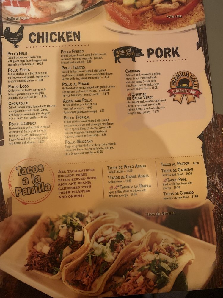 Grilled chicken on a bed of rice with melted cheese. add chorizo (mexican sausage) for an additional charge.
