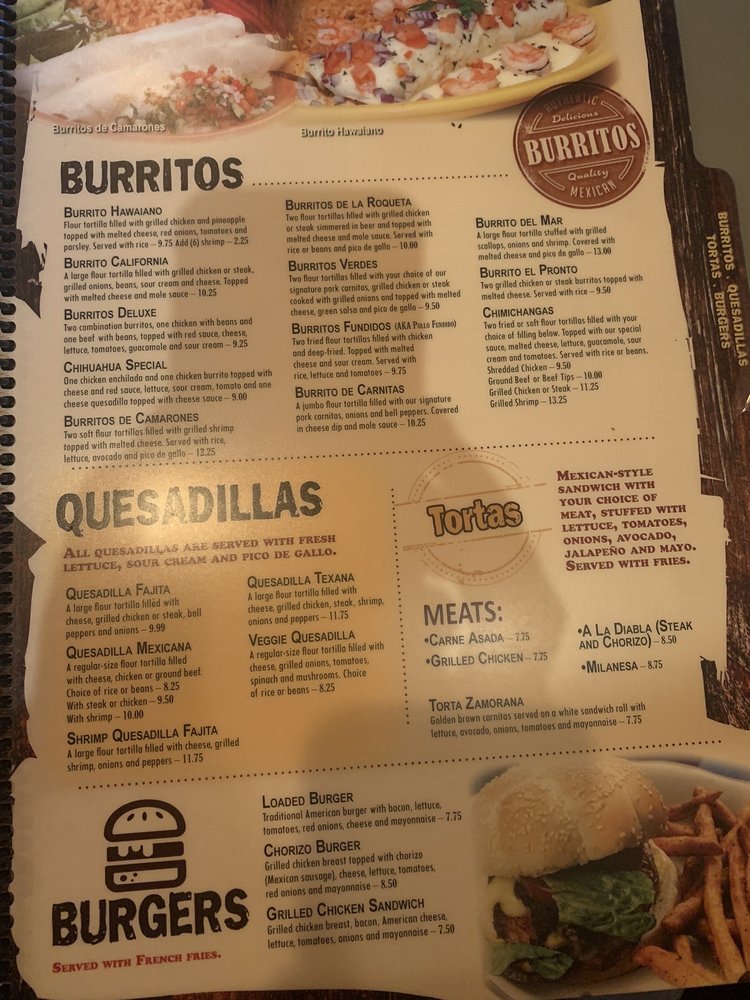 Combo with choice of burrito (range: beef tips to steak chimichanga, including burrito california & burrito del mar), one enchilada (options from rojas to la chona, plus flautas), and a chile relleno.